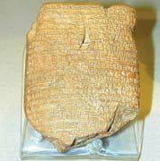 四1泥版地图 在泥版(和合本:“砖”)上绘制的地图虽然十分罕见,加喜特时代(公元前15世纪)却有一幅尼普尔城的地图。其上绘有从幼发拉底河伸展出来的多条运河,并且显示这些水道流入城中分割出来的各区。图中有两条平行线,表示三个城门和城墙。庙宇和仓库也都在地图中标明。西帕尔的遗址附近又发现了一个世界地图,按考证来自公元前7世纪。一条河环绕圆盘状的世界,图顶绘有群山。图中标明了巴比伦、亚述,以及其他城市和国家。