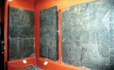 二6尼尼微宫殿 “无可匹敌的宫殿”,或今日所称“西南宫殿”,是西拿基立王于公元前703至公元前691年间所建,由许多互相连结的房间和宫廷所构成(估计有一千六百三十五乘七百八十六平方英尺,可以容纳二十五座美式足球场)。最靠近御座的地方,有石灰岩雕刻装饰的外墙,巨大的雕像(有翼的公牛,有鱼鳞的巨人)以及精细的军事战役浮雕。功能更实用的外院,则没有煞费苦心的设计或雕像。
